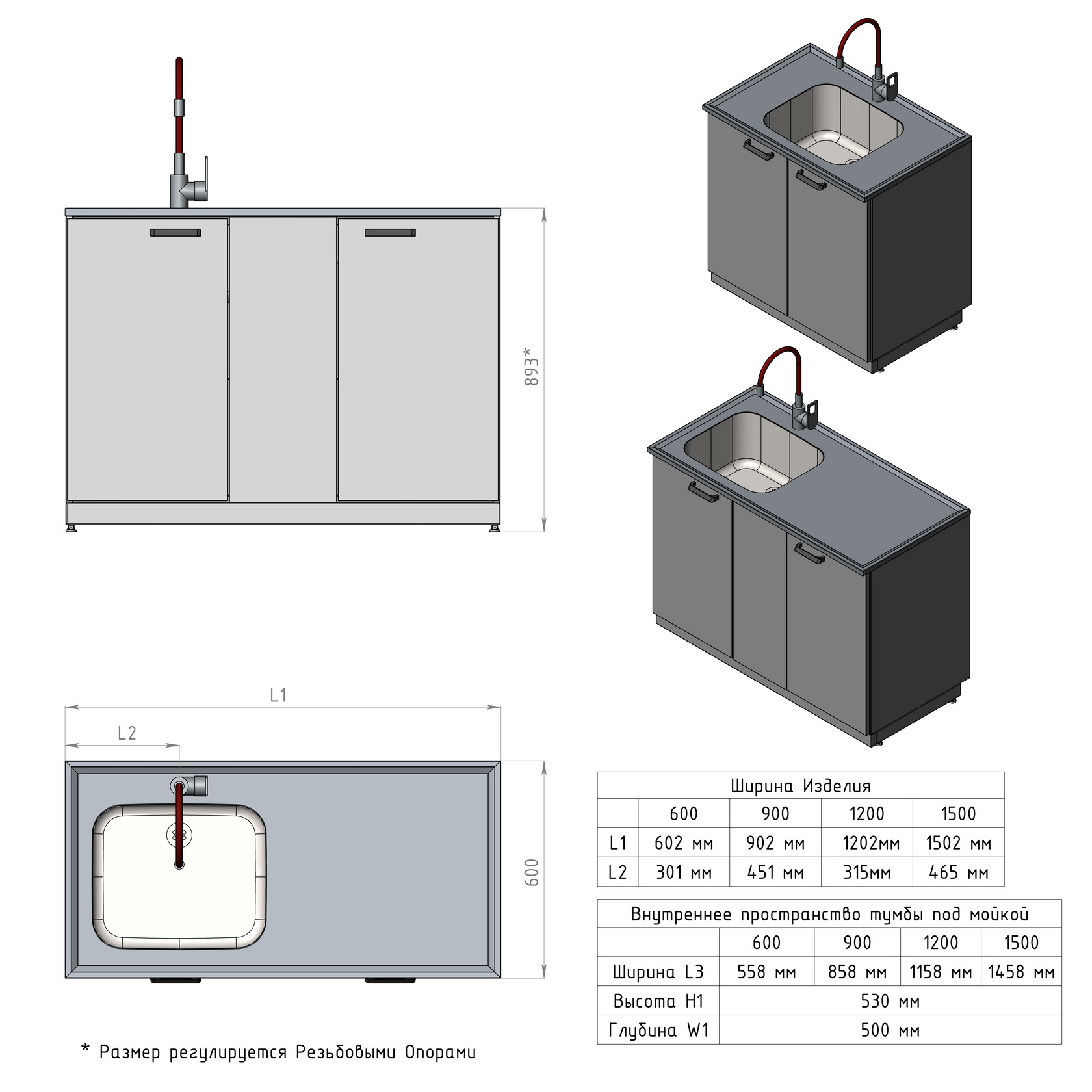 Корпус мойки лабораторной металлической ЛК-1200 СМС-Г (1 раковина, 1 смеситель) может быть выполнен: