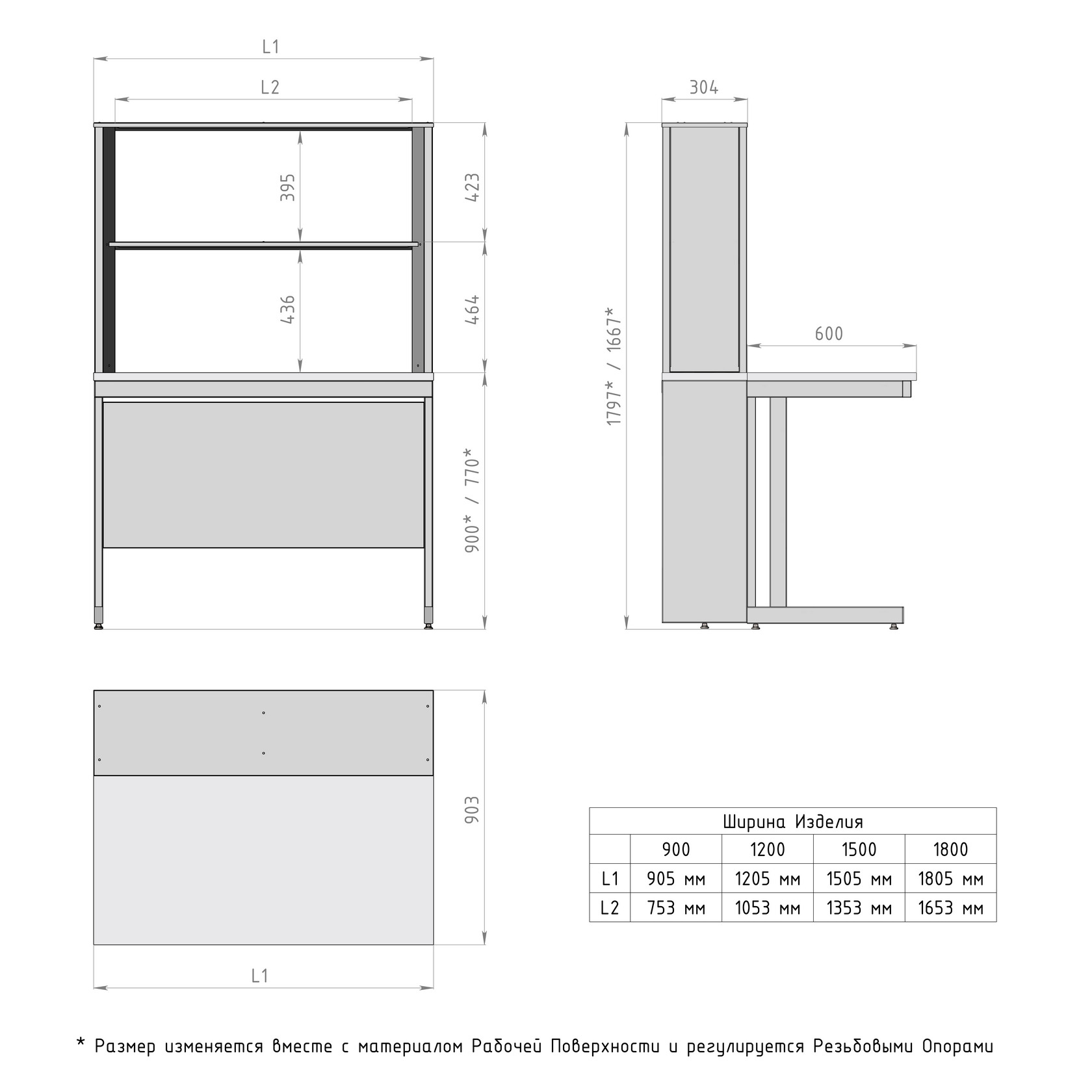 В каркасе лабораторного стола предусмотрены регулируемые опоры в диапазоне 0-30 мм для компенсации неровностей пола.