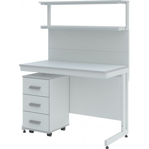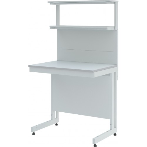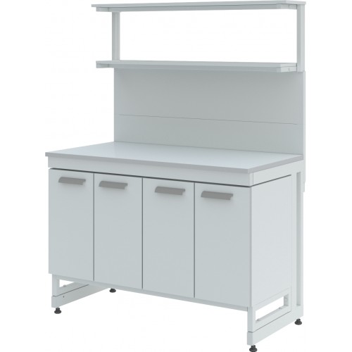 Стол лабораторный с двумя полками ЛК-1500 СП состоит из прочного сборно-разборного металлического каркаса с полимерным покрытием серого цвета, металлической надстройки с двумя полками из стали и столешницы.