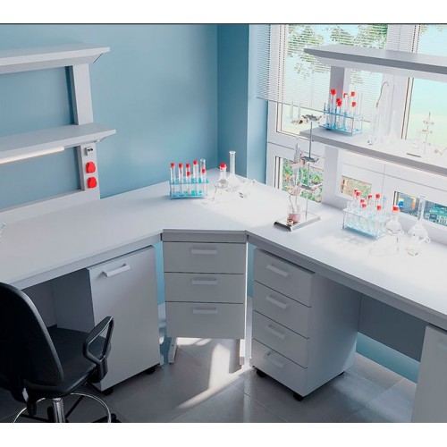 Для повышения функциональности помещения мебель должна размещаться в том числе в углах, чтобы площадь использовалась наиболее эффективно. В лаборатории получить дополнительное пространство для работы и хранения позволит установка углового стола.