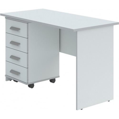 Стол письменный выполнен из ламинированной ДСП. Состоит из столешницы, двух боковых опор и поперечной царги. Толщина столешницы - 16 мм. Дополнительно может комплектоваться подкатными тумбами.
