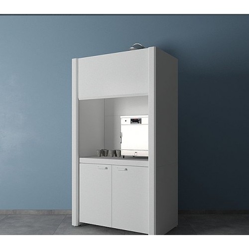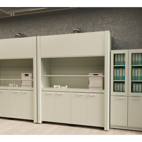 Вытяжная камера шкафа (верхняя часть) изготовлена из стали с полимерным покрытием. Рабочая камера имеет три зоны вытяжки - сверху, посередине и снизу рабочего объёма. Нижняя часть - прочный металлический каркас с полимерным покрытием серого цвета. В каркасе предусмотрены регулируемые опоры в диапазоне 0-30 мм для компенсации неровностей поверхности.